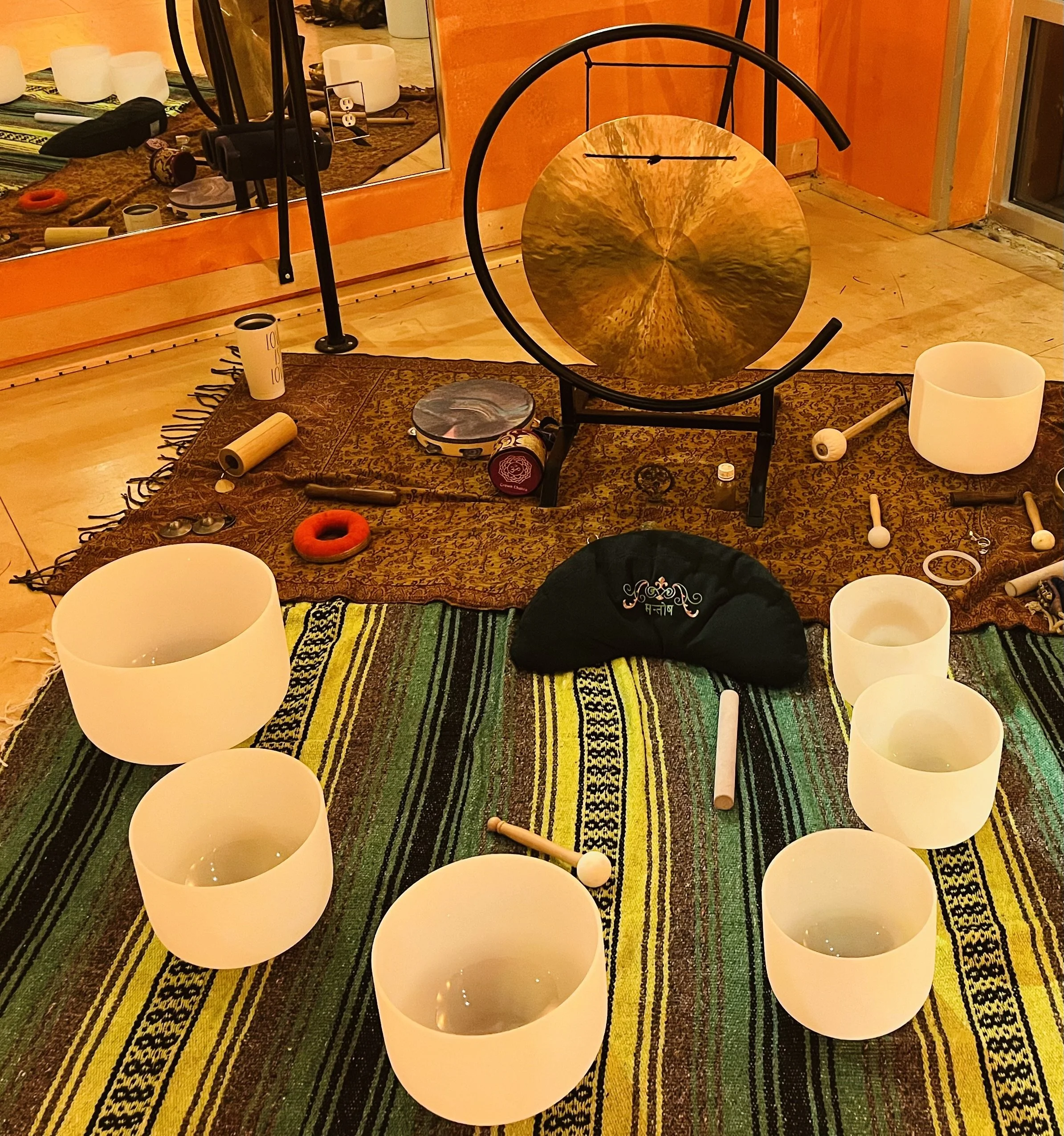 Sound baths include Chakra Balancing, Gongs, Crystal Bowls, Chimes, and Mantras